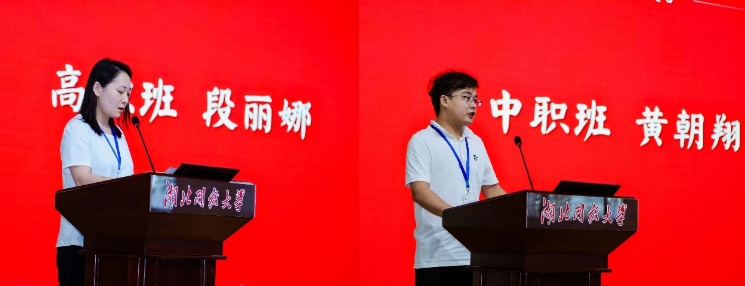 来自湖北城市建设职业技术学院的段丽娜老师和大冶市职业技术学校的黄朝翔老师,分别代表高职班和中职班学员发言。段丽娜表示看到课表后深感培训内容丰富、形式多样,期待接下来的学习。黄朝翔认为本次培训是一个充电、交流、提升的机会,希望能进一步提高自身综合素质和专业技能。参训的老师们表示将珍惜宝贵的学习机会,严格遵守培训纪律,相互学习共同提高。