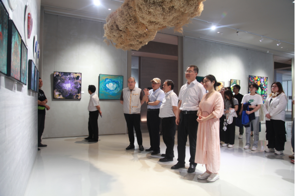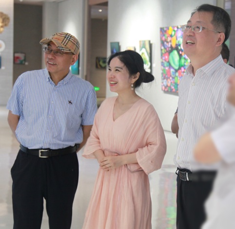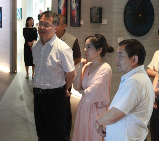 本网讯(通讯员  刘捷文/图)“强烈的色彩感、强烈的生命力、强烈的张力、强烈的时代感”,6月7日上午,党委书记刘义、副校长宋移安一行参观时搏·体育青年艺术家王娟娟作品展“幻化的图像”时,不吝赞美之词,在刘义书记看来,作品大胆采用新的材料试验色彩,聚焦神秘和深邃,用抽象和幻化的方式表达出对自然、生命、宇宙的思考,主题创新,艺术语言新锐,彰显了文化自信,同时展现了时搏·体育青年教师的创作水平和科研成果。
