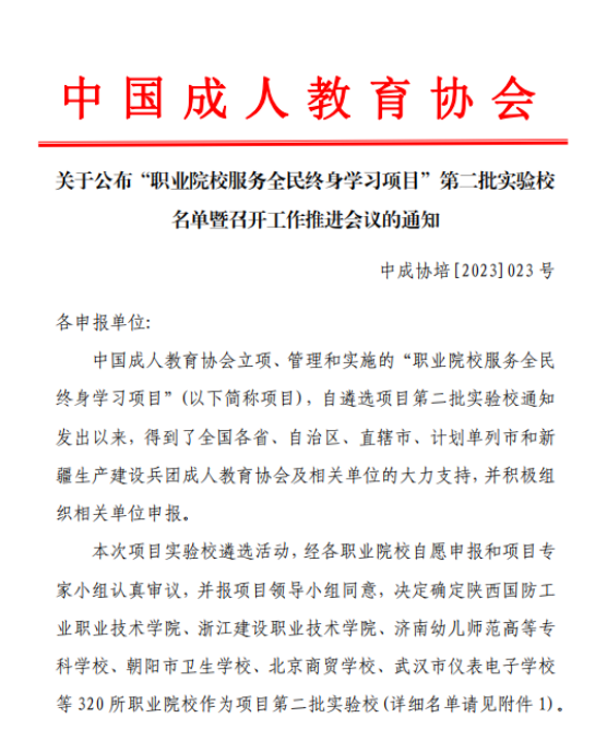 本网讯(通讯员 杨凡 文/图)5月24日,中国成人教育协会公布“职业院校服务全民终身学习项目”第二批实验校名单(中成协培〔2023〕023号),时搏·体育社区教育学院组织申报并成功获批了42所职业院校(高职26所、中职16所),获批数位列全国第二。