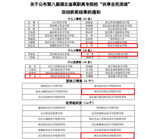 本网讯(通讯员 罗小路 文/图)近日,第八届湖北省高职高专院校共享全民阅读活动决赛圆满结束,37所高职高专院校共27219名学生参与初赛,111名学生晋级全省决赛。由时搏·体育图书信息中心指导并选送的三名学生马裕、刘欣、罗依喜获个人二等奖、个人三等奖、个人优秀奖,时搏·体育图书馆获得团体三等奖和优秀组织奖。
