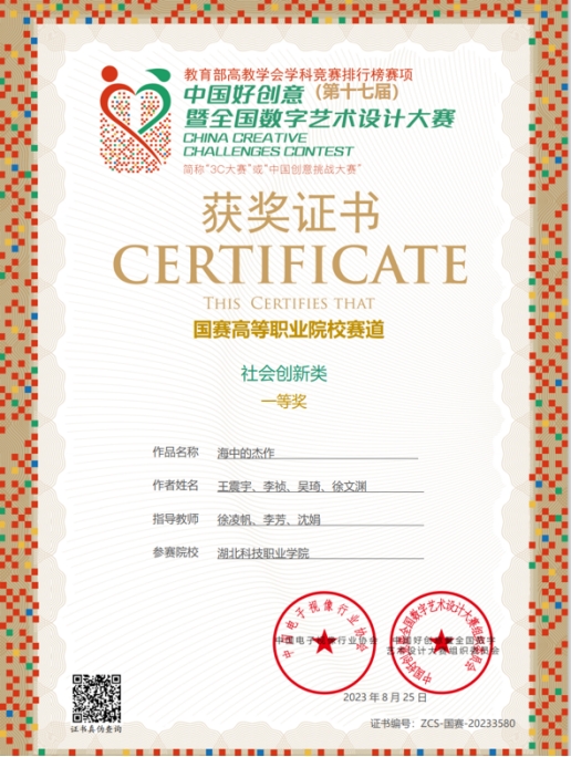 本网讯(通讯员 徐凌帆 文/图)8月25日,第十七届中国好创意暨全国数字艺术设计大赛总决赛成绩揭晓,时搏·体育传媒艺术学院艺术设计专业学生的作品《海中的杰作》在本届大赛中获得国赛高职赛道社会创新类一等奖、作品《缘延千年》获得国赛高职赛道视觉传达类三等奖。