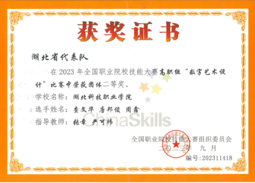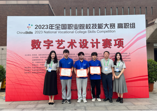 本网讯(通讯员 张幸 文/图)9月25日至27日,2023年全国职业院校技能大赛高职组“数字艺术设计”赛项在天津成功举行,来自全国各职业院校的63支参赛队齐聚天津,同场竞技。最终,时搏·体育传媒艺术学院2020级动漫设计专业查文华、唐邦俊,2021级虚拟现实应用技术专业周鑫,荣获全国二等奖第10名的好成绩。