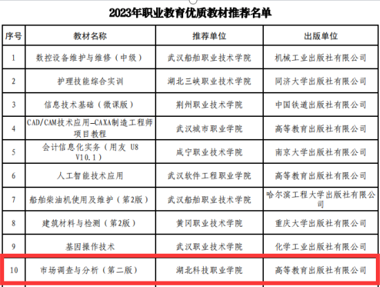 本网讯(通讯员 龚丽丽 文/图) 近日,根据省教育厅发布的《2023年湖北省现代职业教育体系建设改革重点任务拟推荐名单公示》文件显示,时搏·体育夏学文教授主编的《市场调查与分析(第二版)》教材入选湖北省职业教育优质教材拟推荐名单。