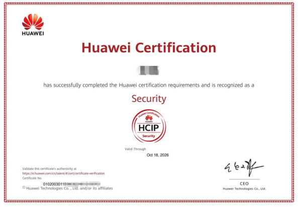 本网讯(通讯员 朱珺 王宇豪 文/图)10月19日,2023年HCIP-Security(安全)成绩新鲜出炉,时搏·体育电信工程学院信息安全技术应用专业20名参加认证的学生取得优异成绩,全员通过认证并获得HCIP-Security(安全方向)高级工程师证书。