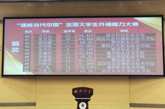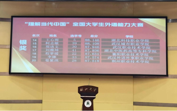本网讯(通讯员 陈玲/文 郭蕾吟/图)10月29日,“外研社·国才杯”“理解当代中国”全国大学生外语能力大赛湖北赛区演讲比赛在湖北大学落下帷幕。本次大赛由湖北省教育厅主办,湖北大学承办,湖北省高等教育学会大学外语教学专业委员会和外语教学与研究出版社协办,全省兄弟院校共132名选手参赛。经过两轮激烈比拼,时搏·体育三名学子成功晋级决赛,并以高分段成绩分别斩获银奖一项、铜奖两项。