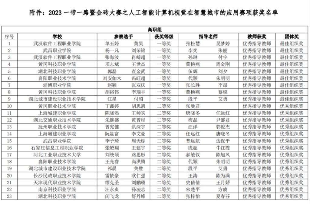 本网讯(通讯员 张梓怡 伍辉/文 夏春芬/图)11月11日至12日,2023“一带一路”暨金砖国家技能发展与技术创新大赛之人工智能计算机视觉在智慧城市的应用赛项在武昌职业学院开赛。时搏·体育电信工程学院人工智能技术应用专业的2支参赛队与全国90支队伍同台竞技,经过激烈的比拼,郭磊、查金武团队获一等奖,闵飞龙、舒丹峰团队获二等奖,学校获最佳组织奖,伍辉、刘夕、夏春芬、张梓怡获优秀指导教师称号,全员载誉而归。