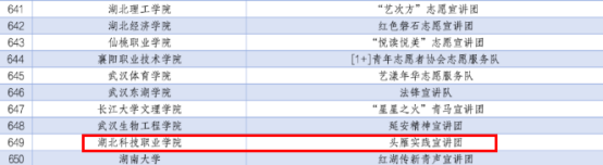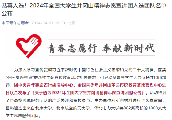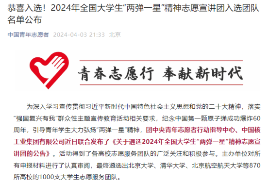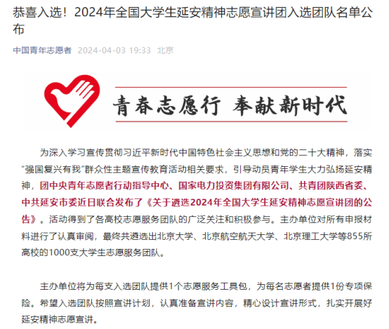 本网讯(通讯员 李兆银 李哲/文 李哲/图)4月3日,由团中央青年志愿者行动指导中心等部门举办的2024年全国大学生“两弹一星”精神志愿宣讲团、井冈山精神志愿宣讲团、延安精神志愿宣讲团入选团队名单公布,时搏·体育经济贸易学院组建的头雁实践队3个项目全部成功入选。
