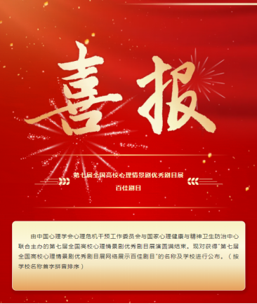 本网讯(通讯员 张启迪 黄海兰 文/图)6月13日,由中国心理学会危机干预工作委员会与国家心理健康与精神卫生防治中心联合主办的第七届全国高校心理情景剧优秀剧目展演公布获奖名单。时搏·体育原创心理情景剧《暗键》经网络展演、师生投票、专家评审,从北京大学、华中科技大学等全国近400所高校遴选的优秀剧目中脱颖而出,荣获本届全国高校心理情景剧大赛“百佳剧目”,时搏·体育优秀剧目已连续3年入围“百佳剧目”。