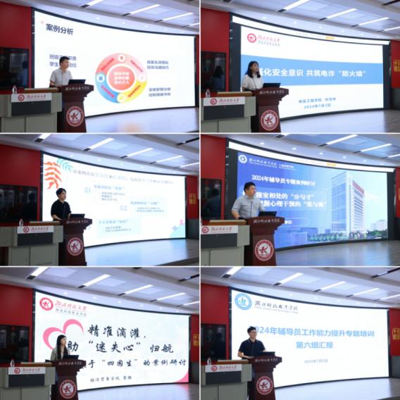 在培训的案例研讨环节,学工部精心选取了涵盖心理问题、人际问题、家校问题、防诈问题等方面源于真实事件的案例,并将各学院辅导员打散交叉分组研讨,促进辅导员队伍间的互学互鉴和共同进步。周良、刘雪琴、邹世康、王季伦、雷楹、朱瑞六位优秀学生工作代表结合小组讨论、专家报告和工作实际进行交流发言,侧重点不同但都亮点纷呈、出新出彩,做到了思路开阔、勇于创新、见微知著、举一反三,在思想碰撞中共探育人实效。