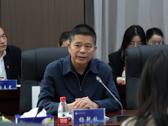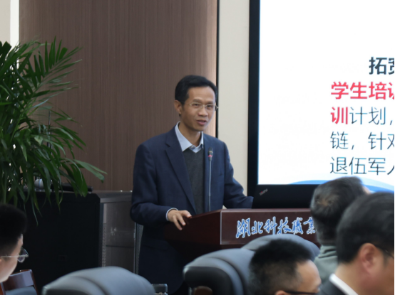 湖北省教育厅职成处一级调研员杨乾秋在成立大会上讲话。他指出,成立理事会,既是学校发展历程中的一件大事,也是湖北省职业教育发展中的一件喜事。他代表省教育厅对学校第一届理事会的成立表示祝贺,对学校近年来建设发展取得的成效给予充分肯定,并对学校及理事会未来与前景表达了三点希望:一是希望学校顺应教育资源多元化、教育需求多样化的时代要求,自觉加强理事会建设,为学校建设发展提供有力支撑;二是希望学校与各理事单位建立更加稳定、全面、紧密的合作关系,在优势互补、互惠互利的基础上实现各方共同和谐发展;三是希望学校和理事会主动服务区域经济社会发展,助推教育与产业深度互动,助力湖北职业教育进一步发展,为奋力谱写中国式现代化湖北篇章贡献智慧力量。