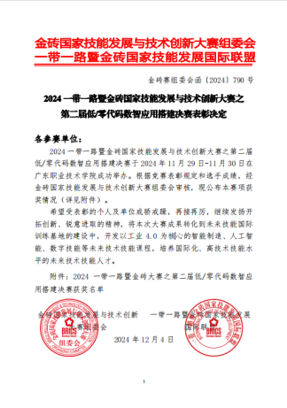 本网讯(通讯员 辛玲 文/图)11月29日至30日,2024一带一路暨金砖国家技能发展与技术创新大赛之第二届低/零代码数智应用搭建决赛在广东职业技术学院举办。来自全国的216支高职院校队伍和65支本科队伍参加角逐,时搏·体育人工智能学院师生在比赛中展现出高超的技术技能水平和优良的精神风貌,凭借扎实的专业知识和精湛的实践操作能力,在众多参赛队伍中脱颖而出。教师辛玲、李春风指导的肖可欣、程雨薇、郭倩获二等奖,学校荣获优秀组织奖。