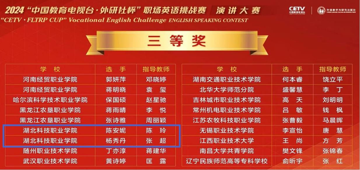 本网讯(通讯员 陈玲/文 谢贝妮/图)2024“中国教育电视台·外研社杯”职场英语挑战赛演讲大赛全国决赛于12月12日至17日举办,大赛以线上和线下结合的方式,汇集全国30个省、市、自治区晋级的98名选手决战巅峰。经过四个赛段的激烈比拼,时搏·体育2023级电子商务4班洪巧儿同学荣获一等奖,2022级市场营销2班陈安妮同学和2023级大数据与财务管理1班杨秀丹同学荣获三等奖。